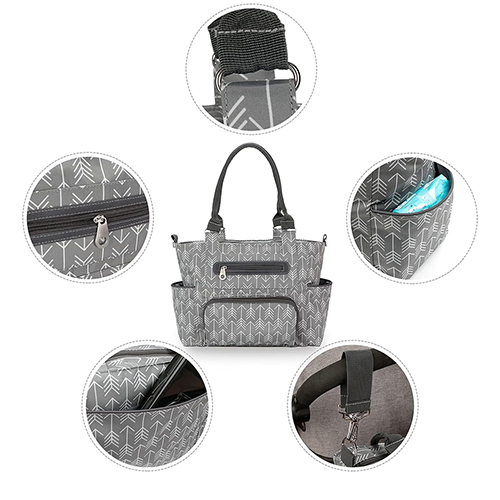 - حقيبة حفاضات رئيسية: تحتوي على مساحة كبيرة لتخزين جميع مستلزمات طفلكِ الأساسية، بالإضافة إلى جيوب صغيرة لتنظيم الأشياء الأخرى.