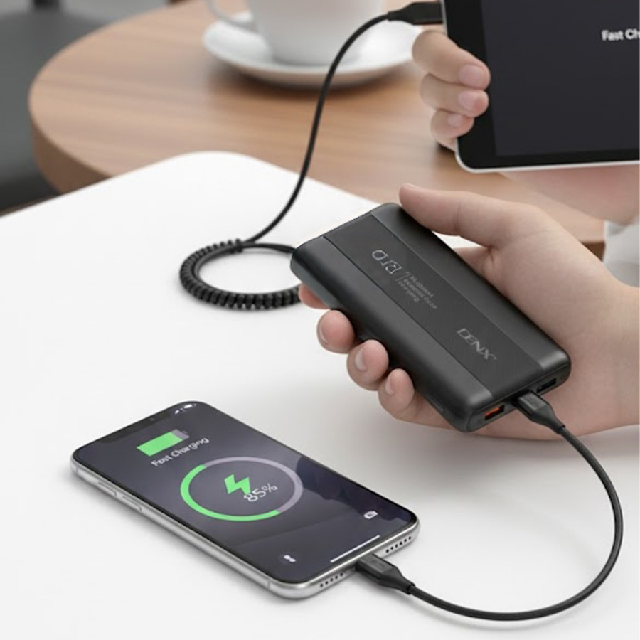 اشحن أجهزتك بسرعة مع باور بانك DENX DX432 بسعة 10000 مللي أمبير، يدعم شحن سريع ومتعدد المنافذ للهواتف والأجهزة اللوحية بسهولة وأمان.