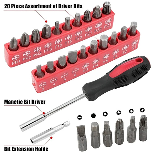 - رؤوس مفكات (20 قطعة): تشمل رؤوس متنوعة لتلبية جميع احتياجاتك.