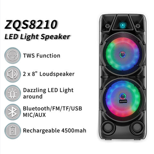 مكبر صوت ZQS8210 بتقنية البلوتوث مع بطارية قابلة لاعادة الشحن واضاءة RGB ، يدعم TWS ، FM ، USB، مع ميكروفون وجهاز تحكم عن بعد
