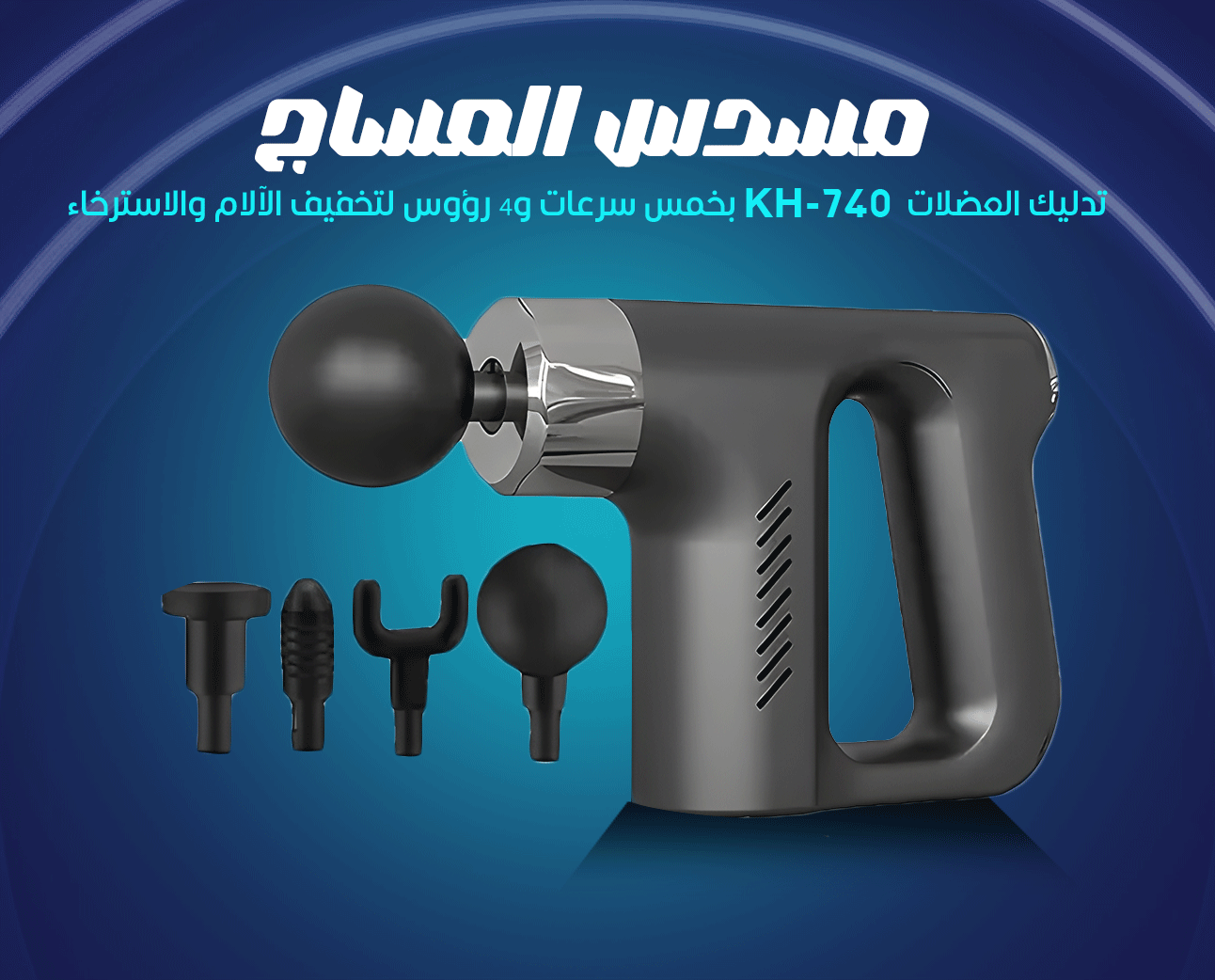 استمتع بتدليك عميق مع مسدس العضلات KH-740 المزود بـ5 سرعات و4 رؤوس مختلفة لتخفيف التوتر وآلام الجسم وتحسين الدورة الدموية والاسترخاء التام.